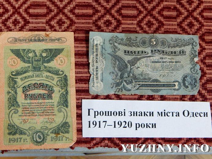 «Ежегодно такими небольшими выставками, исходя из возможностей нашего музея, мы отмечаем День Соборности Украины. Это очень весомый для государства праздник. В наших хранилищах не так много экспонатов начала XX столетия, ведь мы молодой музей. К тому же, стоит учитывать, что в то время нашего города еще не было. Поэтому мы привязываемся больше к событиям Одессы. Когда мы говорим о Первой мировой войне, о борьбе за независимость на территории Украины, то обращаем внимание на «военный» уголок, а именно австро-венгерский шлем, который говорит о том, что Одесса оказалась в прифронтовой зоне, где было много военных. Стоит отметить, что Одесса город со своей спецификой, в первую очередь город торговый, для одесситов очень важным было иметь деньги для ведения своей деятельности. В связи с тем, что власть постоянно менялась (за тот период 14 раз), то и денежные единицы тоже. По нашей коллекции можно судить, кто был при власти в тот период. Очень ценными продолжали оставаться денежные единицы Российской Империи. А уже позже, когда советская власть совершила переворот в 1917 году, появилась новая денежная единица. До конца этого года одесситы ощущали «денежный» голод, поэтому украинская власть разрешила в Одессе производить собственные деньги, это, наверное, был первый и единственный такой случай. Эти деньги имели название – разменный билет города Одессы. В нашей коллекции представлены такие купюры.
