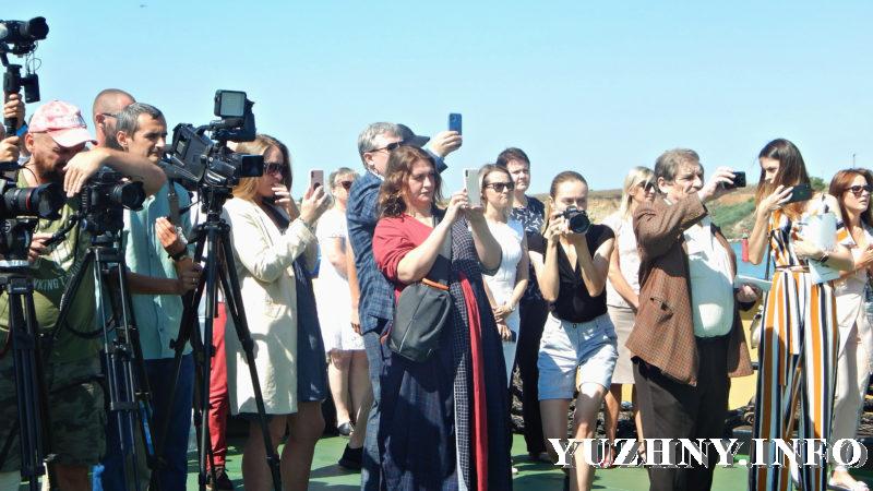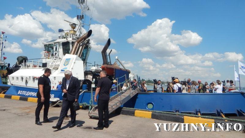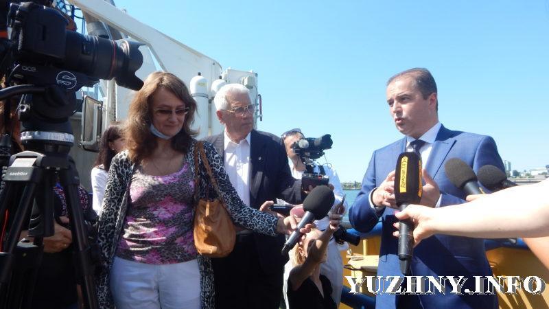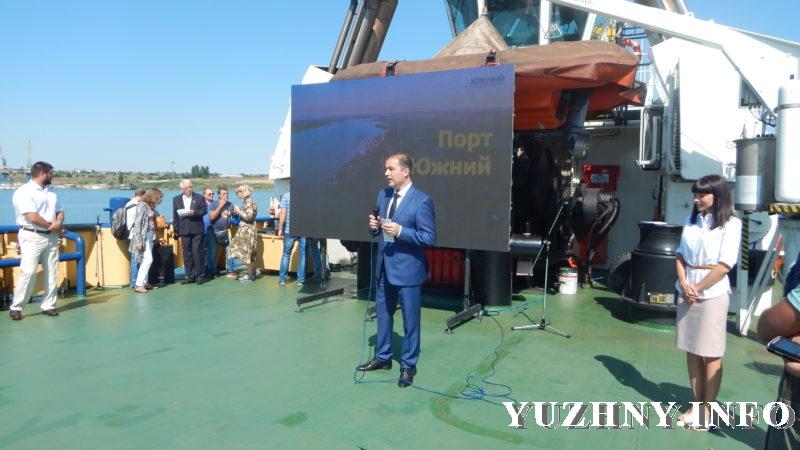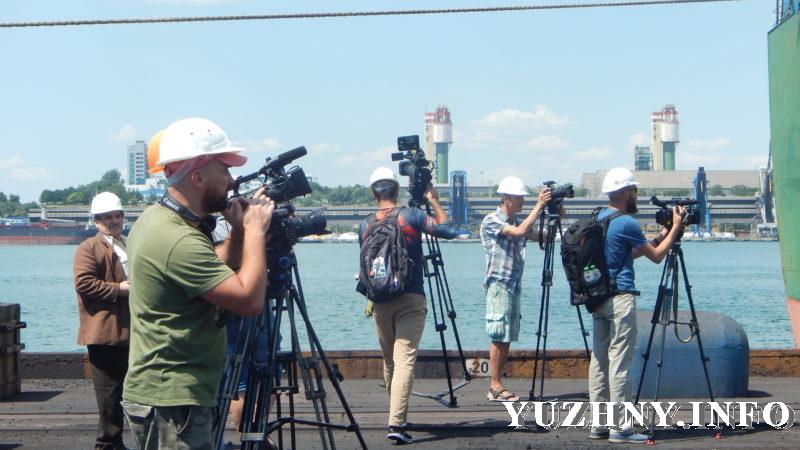 На государственном предприятии «Морской торговый порт «Южный» подвели итоги работы за первое полугодие 2020 года и стоит отметить, что госстивидору есть чем гордиться. За эти шесть месяцев удалось достичь исторических максимумов, которые еще несколько лет назад казались невозможными: рост показателей перевалки грузов до 10,6 млн тонн (+61% к показателю аналогичного периода 2019 года), суточная норма выгрузки (31 мая – 959 единиц) и суточная норма обработки полувагонов (1 056 единиц). Коллектив порта обработал 144 545 полувагонов (+46%). О деятельности порта, стратегических планах и рекордах портовиков в рамках пресс-тура и.о. директора ГП «МТП «Южный» Александр Олейник рассказал представителям местных и областных СМИ. Ежегодная пресс-конференция с журналистами в этот раз, 17 июля, состоялась в новом формате – в виде морской прогулки по акватории порта на буксире «Владимир Иванов». Сюрпризом для средств массовой информации стал зрелищный вальс буксира. Следующим пунктом экскурсии для ознакомления с деятельностью предприятия изнутри был причал №5, где в настоящее время обрабатывается очередное судно.