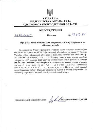 Заступник Південнівського міського голови Леонід Нейков призвався на військову службу.