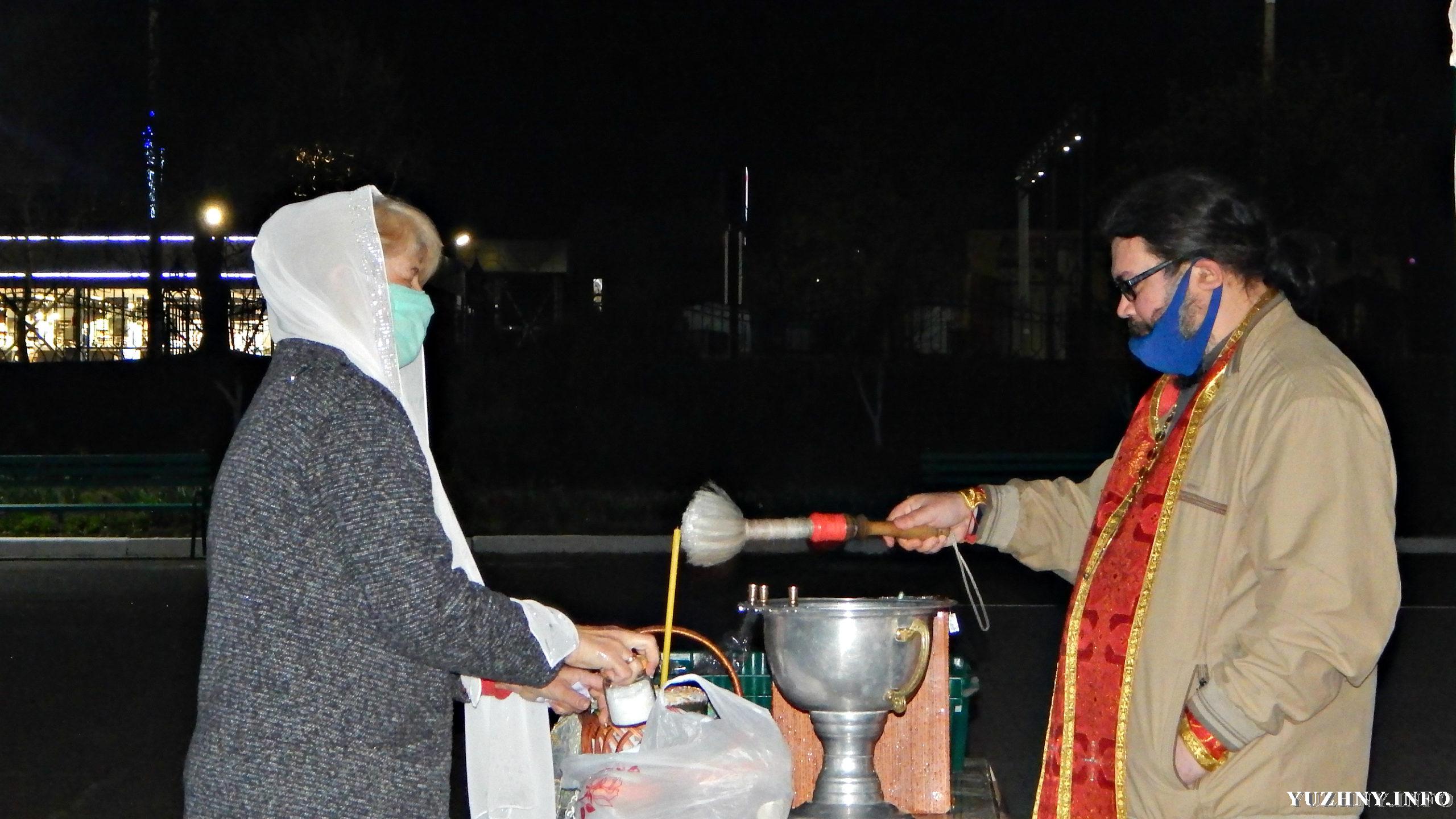 В этом году из-за карантина в связи с коронавирусом, Пасха празднуется по-особенному: верующим не рекомендовалось посещать богослужения и освящать пасхальные корзинки по традиции возле храмов. В целом южненцы прислушались к рекомендациям. Ажиотажа у церквей не наблюдалось. Мы побывали в Свято-Введенском храме и Свято-Покровской церкви с 5.00 до 6.00. Церкви города работали в особом режиме, учитывая все ограничительные карантинные меры. Несмотря на то, что на богослужении разрешалось присутствовать не больше десяти человек, в Свято-Введенском храме во время службы прихожане находились на улице, вход в здание храма был перекрыт, однако люди могли видеть, как проходит служба – главные двери храма были открыты, для удобства на улице также установили звуковые колонки. Вход на территорию разрешается только в защитной маске и соблюдая дистанцию не менее 1,5 метров от других людей.