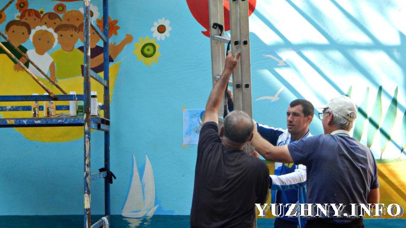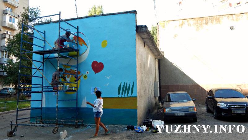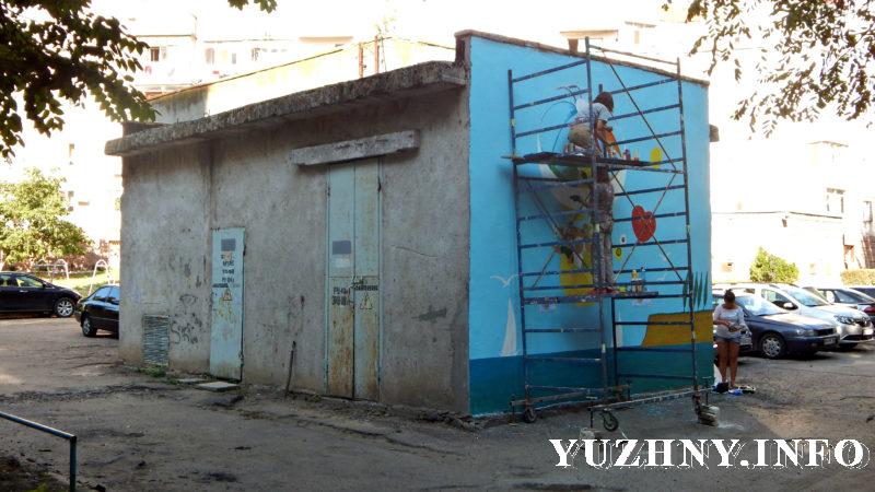 Во дворе дома по ул. Строителей, 9 принялись разрисовывать серые стены бойлерной. Ко Дню города активные жильцы дома под чутким руководством известной южненской художницы Ларисы Демянишиной создают яркий красочный мурал. Рисуют строго по эскизу, на изображении – воздушный шар с детьми, который поднимается ввысь над морем. Как рассказал «Yuzhny.info» председатель правления ОСМД по ул. Строителей, 9 Александр Ануфриев, идея украсить неприглядную бойлерную возникала еще год назад, однако воплотить удалось лишь сейчас. Работы начались в понедельник, 14 сентября.
