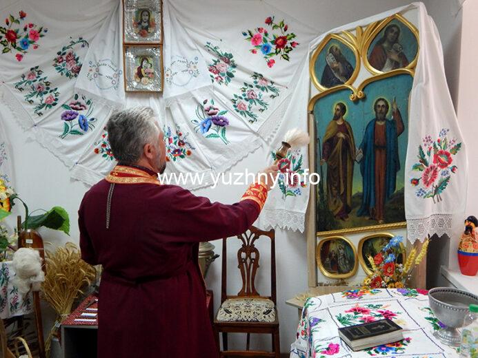 В музее города Южного сегодня, 13 мая, настоятель Свято-Покровской церкви отец Николай по приглашению сотрудников учреждения освятил уникальный музейный экспонат – иконостас, которому больше 200 лет. На нем, в частности, изображены верховные апостолы – Петр и Павел. О том, как этот предмет оказался в Южном, рассказал директор УВК имени В.Черновола Тарас Прокопечко. По его словам, принадлежности одной из старинных украинских церквей, расположенной во Львовской области, в свое время он совместно с настоятелем греко-католического храма перевез в Сычавку. Тогда спецтранспорт для этого выделил главный инженер порта «Южный» Юрий Омельченко. Однако священник, служивший тогда в селе, отказался принимать эти предметы, аргументируя тем, что в Сычавке собирались строить новую церковь. Таким образом уникальный иконостас, который состоит из нескольких частей, забрала на хранение одна из жительниц села. После смерти родственники женщины обнаружили иконостас на чердаке ее дома и передали его. Одна из частей иконостаса сегодня установлена в четвертой школе, другая же теперь заняла свое место в стенах музея Южного. Как сообщила в интервью Yuzhny.info директор учреждения Татьяна Ерошенко, музей принимает множество разных предметов, после чего сотрудники выясняют их историческую ценность.