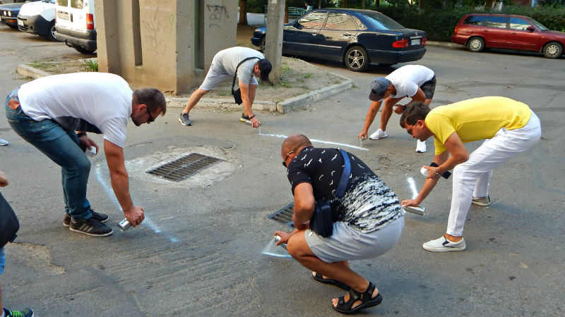 В Южном 8 сентября стартовал флешмоб #Я_вижу_яму_Южный, цель которого обратить внимание городской власти на многочисленные ямы на дорожном покрытии. Сбор активистов начался в 10.00 возле центральной стелы города. Инициатор акции Юрий Катюха определил маршрут, по которому должны были двигаться участники флешмоба, и раздал всем баллончики с краской, чтобы обводить существующие ямы на дорогах города. Стартовал флешмоб с IV микрорайона, куда обводить ямы отправилась вся группа активистов, в последующем участники акции разделились между собой.