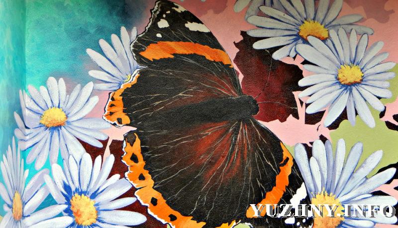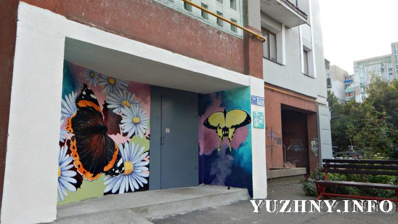 Парадные многоквартирного дома по ул. Шевченко, 7 приобретают новый вид. Житель этого дома, художник Андрей Косарев закончил роспись еще одного подъезда – на этот раз по просьбе жильцов он изобразил масштабные цветы и бабочек. Ранее мы уже рассказывали о его работах, выполненных на стенах двух других парадных – там изображены морские дали и маяк, а также красочный пейзаж – зеленые луга и речка.