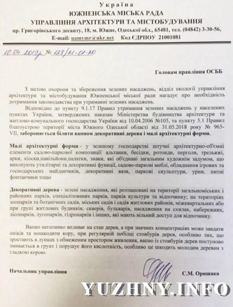 В Южном, как и в целом в Украине, с 2006 года запрещено белить известью декоративные деревья (не плодовые) и малые архитектурные формы в населенных пунктах. Специалисты отдела экологии в составе управления архитектуры Южненского горсовета ежегодно обращаются к председателям ОСМД с предупреждением о данном запрете и напоминают о необходимости соблюдать законодательство при содержании зеленых насаждений.