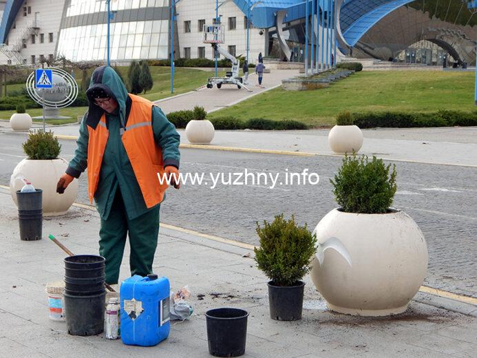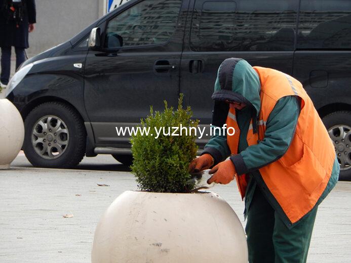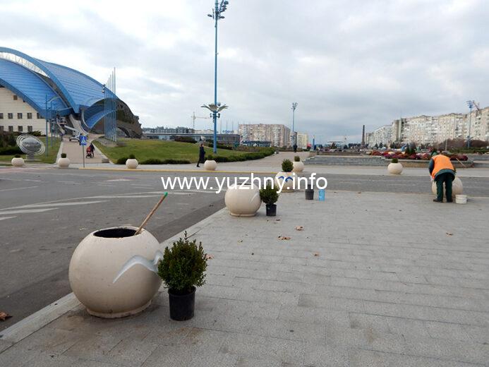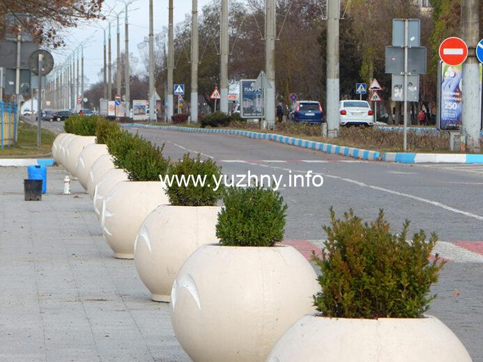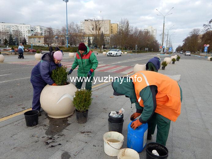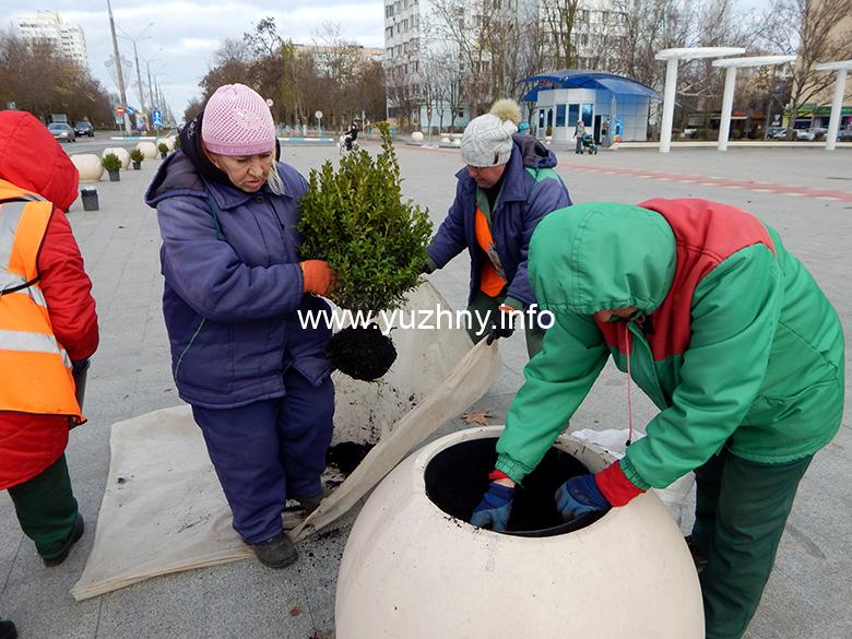 С самого утра, 25 ноября, работники коммунального предприятия «Экосервис» приступили к высадке растений в декоративных вазонах, которые установили в Южном этим летом после завершения реконструкции проезжей части в центре города. Вазоны служат неким ограничителем для движения транспорта, чтобы автомобили не заезжали на пешеходную зону. Как сообщили Yuzhny.info в управлении жилищно-коммунального хозяйства, подрядчик, который выполнял работы по реконструкции проезжей части, заключил договор с КП «Экосервис» для проведения работ по высадке растений. Сегодня озеленители высадили около 30 кустов буксуса.