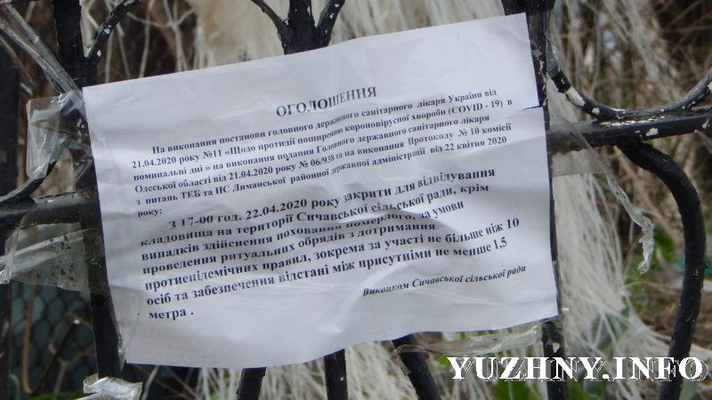Как сообщил «Yuzhny.info» Александр Романенко, директор КП «Ритуальные услуги», вход на кладбище будет закрыт только в воскресенье, 26 апреля, запрета на посещение сегодня и завтра нет. Мы убедились в этом, приехав на кладбище сегодня около 10.00, входные ворота открыты, на территории есть посетители, однако их всего несколько человек. Относительно расположенного поблизости Сычавского кладбища, там вход тоже открыт. Следить за соблюдением карантинных мер и охранять общественный порядок возле Южненского кладбища в воскресенье будут сотрудники Южненского отделения полиции. Об этом «Yuzhny.info» сообщили в пресс-службе горотделения.
