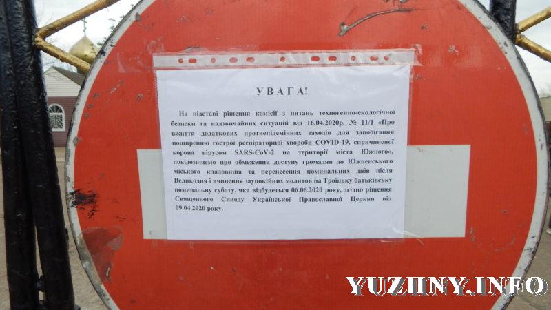 Южненское кладбище в поминальное воскресенье, 26 апреля, будет закрыто для посещений. Подобные ограничительные меры связаны с усилением карантина на территории всей страны. Напомним, Кабинет Министров принял постановление, которое запрещает украинцам посещать кладбища в поминальные дни. А главный санитарный врач Украины Виктор Ляшко издал постановление, рекомендующее всем руководителям городских и областных администраций решить вопрос, чтобы в эти дни люди не ходили на кладбища. На городском уровне решением комиссии по вопросам ТЭБ и ЧС было поручено КП «Ритуальные услуги» ограничить доступ граждан на территорию кладбища и перенести поминальные дни после Пасхи и проведение заупокойных молитв на Троицкую родительскую поминальную субботу – 6 июня этого года, согласно пункту 3 Решения Священного Синода УПЦ от 9 апреля 2020 года.