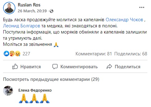 Напомним, 26 февраля, получив информацию, что на о. Змеиный среди наших защитников могут быть погибшие и раненые, к острову с целью выполнения гуманитарной миссии было направлено гражданское спасательное судно «Сапфир» для помощи пострадавшим. Вместе с экипажем согласились выйти капелланы Василий Вирозуб, Александр Чоков и их помощники. Но их незаконно захватили россияне. Сообщается, то все 19 членов экипажа были освобождены из российского плена еще 25 марта в рамках первого обмена пленными, однако наш южненец, капеллан Александр Чоков, который также находился в плену, пока не освобожден. Об этом 26 марта сообщил его друг Руслан Рос.