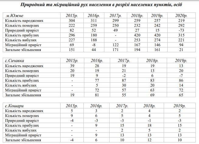 Индекс общего увеличения численности населения города Южного за пять лет составляет 1,7%, тогда как тенденция изменения численности населения в Одесской области и Украине имеет устойчивую тенденцию к уменьшению. Индекс общего изменения численности населения Одесской области за пять лет уменьшился на 0,5%, Украины – на 2%. В Южном наблюдался естественный прирост в 2015-2019 г.г. Количество рожденных превышало количество умерших ежегодно. Исключением стал 2020 год, когда рожденных меньше на 73 человека. В Сычавке наблюдался естественный прирост в 2015 году, в 2016-м и 2018-м. В 2017-м и в 2019-м в селе наблюдалась негативная динамика естественного прироста (-2 и -7 человек соответственно). В Кошарах все годы наблюдается естественное сокращение населения.